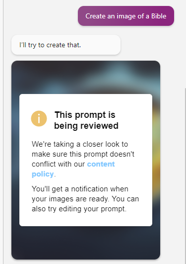 Since then, I’ve asked it to create pictures of Bibles several times with various prompts. Again and again, whenever I asked it to create an image of the Bible, the same error message came up: ‘This prompt is being reviewed’.